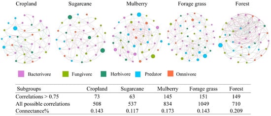 The nematode structure and maturity index were significantly lower in the mulberry plots than in the plots of other land-use types. The footprint of soil nematodes and omnivores–predators, were significantly higher in forest and sugarcane plots than in forage grass, mulberry, or cropland plots (Table 1). The metabolic footprints of herbivores, bacterivores, and fungivores did not significantly differ among land-use types. Whether in the forest or agricultural plots, the sizes of the metabolic footprints of nematodes were in the following order: predator and omnivore > herbivore > bacterivore > fungivore (Figure S1). The nematode network pattern was more complex in the forest plots than in the agricultural plots (Figure 3).