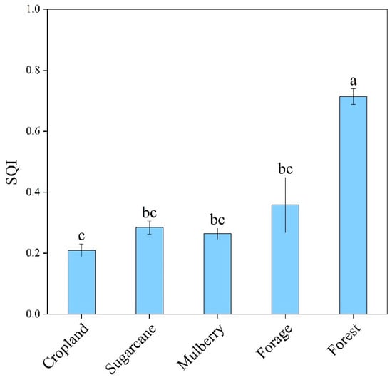 Effects of land-use type on the SQI. Values are means ± SE. Means with the same letter are not significantly different (p > 0.05) according to the LSD test.