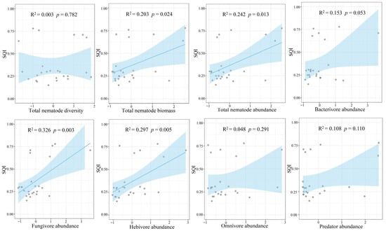 Relationships between SQI and soil nematode properties. Solid line represents a significant linear regression according to an ordinary least squares (OLS) regression model. The area shaded in light blue indicates the 95% confidence interval.