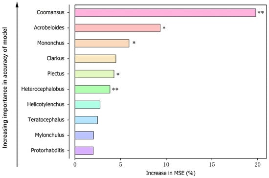 Random forest regression model showing the main nematode genera associated with SQI. * and ** indicate that the genera were significantly associated with SQI at p < 0.05 and <0.01, respectively.