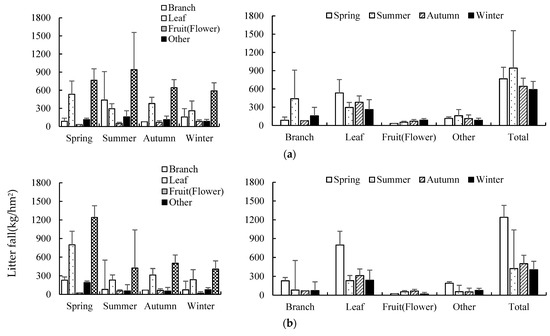 Seasons in this experiment were divided as follows: March–May for spring, June–August for summer, September–November for autumn, and December–February for winter. The monthly litter of different components in different years exhibited significantly different seasonal variation (Figure 3). The total amount of litter in different years was significantly higher than that of other components. In 2005, the components with the highest amount of litter in the other three seasons were leaves, except in summer, which was dominated by branches. The distribution of branch components across seasons peaked in summer. Leaves represented the highest proportion in spring, which then fluctuated and decreased with the passage of summer, autumn, and winter; fruit drop (flower) slowly rose from spring to winter. Other components rose from spring to summer, and then decreased gradually after reaching a high point in summer, with small fluctuations. In 2010, litter was composed mostly of leaves and least by fruit (flower). The seasonal variation in fruit (flower) was lowest in spring. After reaching a peak in summer, fruit (flower) remained stable until autumn, decreased from autumn to winter, and reached the lowest value in winter. The seasonal variation in other components was similar, showing a peak in spring, followed by a sharp decline. In 2015, the maximum value of litter component in winter was branches, and the component with the highest amount of litter in the other three seasons was leaves. The seasonal variation in each component was highest in spring, then decreased reaching the lowest values in summer, and rose thereafter.