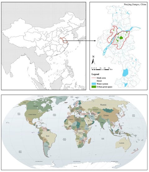 Nanjing City (31°14″−32°37″ N, 118°22″−119°14″ E) is located in East China. It is a typical subtropical monsoon climate with hot summers and abundant rainfall, cold and dry winters, and cool and dry springs and autumns. The vegetation types are mainly deciduous broad-leaved forests that contain evergreen broad-leaved trees and planted coniferous forests. The study area is the central urban area delineated in the Draft Nanjing Urban Master Plan (2018–2035). The total area is about 818 square kilometres, accounting for about 12.42% of the total area of Nanjing. The delimitation of the research area is mainly based on the following three considerations: (1) the city centre area has a dense built environment and population distribution, which is suitable for studying the interaction between the daily life behaviour of individual residents and the aggregated green infrastructure; (2) the commodity housing prices in Nanjing have generally maintained an upward or stable trend and never experienced a significant decline since the 21st century; (3) the POI of the average price, population, transportation, businesses, entertainment, and public facilities in the residential area of the city centre is easily accessible.