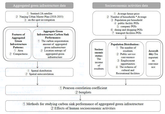Previous studies have shown that many cities have implemented the low carbon city evaluation index system [40,41]. Among the indexes, the green environment construction and carbon sink capacity were the main evaluation indicators [42]. Therefore, based on the obtained data and the previous-built carbon sink city evaluation systems, the study regarded aggregated green infrastructure environment construction and carbon sink capacity as the influencing factors of its carbon sink performance in the central urban area of Nanjing. We selected aggregated green infrastructure area and density as the influencing factors of aggregated green infrastructure construction. In the meantime, the carbon sequestration amount of aggregated green infrastructure and location entropy were selected as the influencing factors of the carbon sink performance of aggregated green infrastructure. The analysis was performed in combination with socioeconomic activities data, and a more in-depth discussion on urban carbon sink performance was conducted based on urban development laws. The detailed experimental steps are shown in Figure 2.