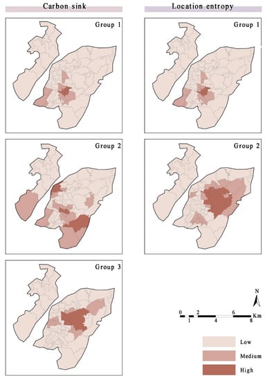 In summary, aggregated green infrastructures with a carbon sequestration range of 0.1922–7.5511 t/a and location entropy range of 0.0387–1 were mainly distributed in the areas of the old urban area. These aggregated green infrastructures are the most attractive to socioeconomic activities.