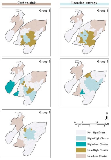 From the perspective of carbon sequestration amount, spatial autocorrelation analysis showed that the first group of carbon sequestration exhibited the largest Moran’s I index and the largest Z value, while the third group showed the smallest Moran’s I index and the smallest Z value (Table 5). It indicated that the aggregated green infrastructures with small carbon sequestration amounts had a relatively high degree of aggregation. In addition, the p values of carbon sequestration in the three groups were all less than 0.01, indicating that the carbon sequestration in the three groups had extremely significant space autocorrelation. From the perspective of location entropy, the largest Moran’s I index of location entropy appears in the first group, and it also showed the largest Z value. However, the second group exhibited the smallest Moran’s I index of location entropy and the smallest Z value. It indicated that aggregated green infrastructures that have less location entropy will appear relatively significant space aggregation. In the meantime, the p-values of the two groups were both less than 0.01, indicating that the two groups had extremely significant space autocorrelation. Overall, the lower the carbon sequestration amount in aggregated green infrastructure, the more significant the spatial correlation, and vice versa.