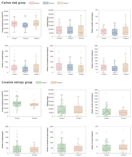 In the paper, boxplots were adopted to analyse the correlation characteristics between factors. After comparing the correlation between aggregated green infrastructures with different carbon sequestration levels and human activities, it presented the following six types of data, i.e., the population, income, employment opportunities, and richness of cultural and recreational facilities within the area (Table 6). All exhibited good value if the carbon sequestration amount was in the range of 0.1922–7.5511 t/a. It means that aggregated green infrastructures with this range of carbon sequestration amount have more population, higher income, and more employment opportunities. This range also indicated better transportation convenience, better public service convenience, and more cultural and entertainment facilities. After comparing the relationship between aggregated green infrastructures of different location entropy and human activities, it is found that the six types of data (i.e., the population, income, transportation convenience, public service convenience, employment opportunities, and cultural and recreational facilities richness within the area) presented good value when location entropy was in the range of 0.0387-1. It means that the aggregated green infrastructures with this range of location entropy have more population, higher population income, better transportation convenience, better public service convenience, more employment opportunities, and more cultural and recreational facilities (Figure 5).