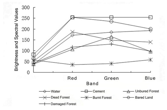 The RGB spectral characteristics of unburned forest, damaged forest, dead forest, burnt forest, bared land, cement surfaces, and water bodies observed in UAV images after a forest fire in the study area were analyzed. With the help of the remote sensing software ENVI 5.3, more than 30 sample areas of each type of ground object were collected, and the spectral mean and luminance mean values of each class were statistically explored. The pop curve relationship of all types of ground objects is shown in Figure 3.