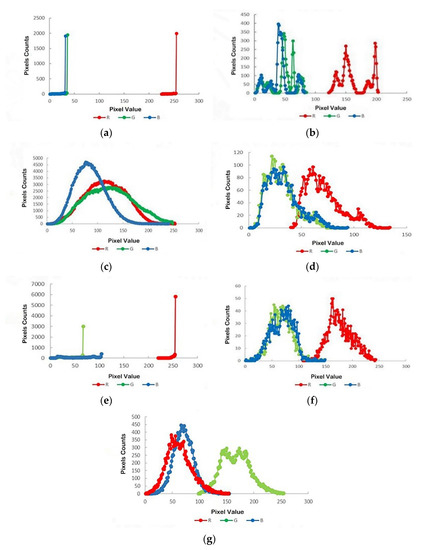 Examples of RGB pixel distribution map: (a) RGB band pixel value distribution map on cement surface; (b) RGB band pixel value distribution map of water body; (c) RGB band pixel value distribution map of damaged forest; (d) RGB band pixel value distribution map of burnt forest; (e) RGB band pixel value distribution map of bared land; (f) RGB band pixel value distribution map of dead forest; (g) RGB band pixel value distribution map of unburned forest.