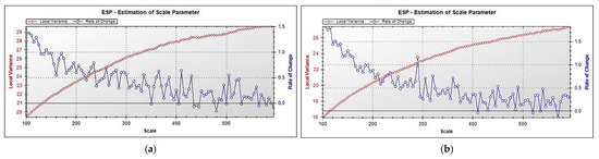 Optimal segmentation scale obtained by ESP under different images: (a) original image ESP optimal segmentation scale; (b) mathematical morphology filter image ESP optimal segmentation scale.