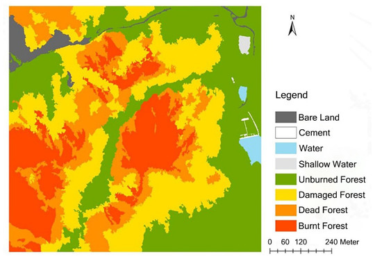 The remaining features include bared land, cement surfaces, shallow water, and damaged forest areas. Because LEVEL 5 is the smallest layer of scale segmentation, there is a partial over-segmentation phenomenon in damaged forest areas. Regarding the appearance, we can first extract the other three feature types with better segmentation. Afterward, comprehensive analysis demonstrated that there is favorable texture separability for bared land, cement surfaces, and shallow water water, and it is easy to distinguish these three types of ground objects by combining features N and A. Finally, the unclassified area is defined as the damaged forest area.