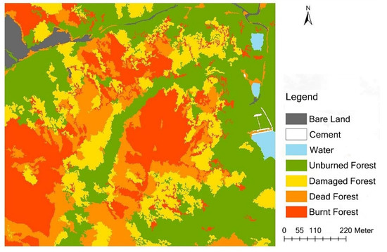 According to the statistics, the total area where damaged forest, dead forest, and burnt forest is 54.4 hm2. The total acreage of lacerated vegetation is 55.24 hm2, as determined from the visual interpretation. The error rate is 1.52% compared to the visual interpretation, which indicates that the extraction accuracy of the overall area of damage from forest fires is higher than that provided by predecessors UAV surveys. In addition, it can meet the forestry industry accuracy of special surveys and design of 95%. The conclusion reveals that visible UAV images can be appropriate for investigating forest fires.