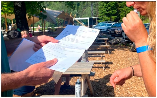 - On Saturday, 19 June 2021, during the day, tourists divided into 4 groups 2× (1× morning and 1× afternoon) and participated in FT. The first FT session lasted 3 h and was conducted between 10 am and 1 pm, and the second lasted for 2 h between 3 pm and 5 pm. Forest therapies were performed by ANFT-certified guides according to the protocol of the educational institution.
