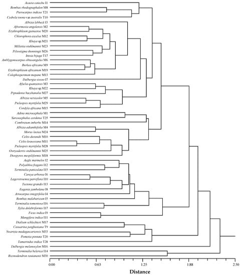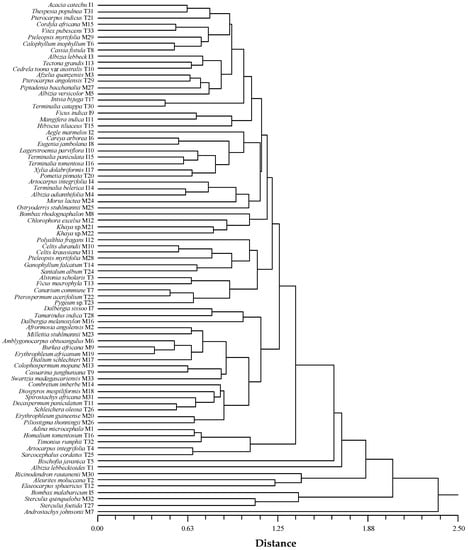 Within the genus, i.e., from the genera showing more than one species (Acacia spp., Albizia spp., Ambylognocarpus spp., Bombax spp., Cedrela spp., Celtis spp., Combretum spp., Dalbergia spp., Erythroplhleum spp., Ficus spp., Morus spp., Pterocarpus spp., Sterculia spp., Terminalia spp., and Xylia spp.), four connections were found: Dalbergia melanoxylon (M16) with Dalbergia sissoo (I7) and Celtis durandii (M10) with Celtis kraussiana (M11), both from Mozambique, Sterculia quinqueloba (M32) with Sterculia foetida (T27), Terminalia bellirica (I14) with Terminalia paniculate (I15), and Terminalia tomentosa (I16) with Terminalia paniculate (I15), even if a long Euclidean distance was observed that highlighted their differences.