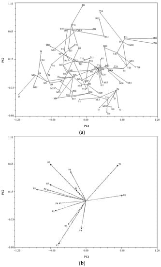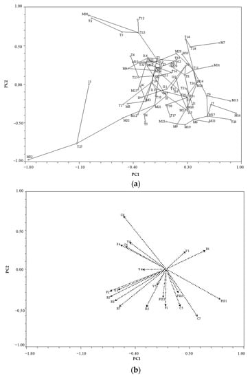 (a) PC1 and PC2 projection plots of the 81 tropical species (as listed in Table 1 and Table 3) based on 20 anatomical and physical wood characteristics (coded in Table 2), overlapped by the MST method (similarity coefficient of 0.87). (b) The indication of the correlation degree between the variables based on the position of the vector.