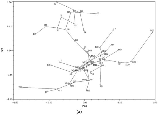 The grouping of species by their geographical location (i.e., India, East Timor, and Mozambique) based on both anatomical and physical characteristics was more evident for the 81 species set, with a stronger tendency to group species from Mozambique. The most dispersed species were Ricinodendron rautanenii (M30), Aleurites moluccana (T2), Alstonia scholaris (T3), Elaeocarpus sphaericus (T12), Ficus macrophylla (T13), Khaya sp. (M22), Sterculia quinqueloba (M32), Albizia lebbeckoides (T1), Sterculia foetida (T27), Bombax malabaricum (I5), and Androstachys johnsonii (M7). In fact, different geographical distribution trends were found when separately analyzing the anatomical and physical characteristics, i.e., anatomical similarity grouped species from East Timor and Mozambique, and dispersed species from India, while the physical similarity aggregated species from India. The analyses showed large clusters of species from India, Mozambique, and East Timor, which reflects their wood properties similarity. The CA clustering was, in general, confirmed by the PCA results. Thus, wood properties were, in general, of limited value in the delimitation of the geographical origin of wood species, and specific features should be considered according to specific species and each region. In fact, numerical taxonomy methods have been very useful in many comparative and phylogenetic studies within different taxa and/or across different ecological gradients, even if they have been mostly based on qualitative anatomical characters [,,,,,].