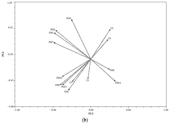 Cumulatively, PCs 1–3 explained 72.3% of the total variance of 54 wood species (Table 5). PC1 explained 30.1% of the variation, and the variable with the highest loadings was the axial shrinkage coefficient (FIS12), in opposition to the other shrinkage characters (volumetric shrinkage, FIS5; tangential shrinkage, FIS6; radial shrinkage, FIS7; the volumetric shrinkage coefficient, FIS9; the tangential shrinkage coefficient, FIS10; and the axial shrinkage coefficient, FIS11). Along PC1, in the top left-hand quadrant, a group composed mainly of the species from India (I17, I16, I6, I8, I10, I13, I11, I15, I9, I4, I5, I12, and I2) is shown to be clearly different from all other sets, showing high values of moisture content (FIS4) and volumetric, tangential, and axial shrinkage (FIS5, FIS6, and FIS7) while showing lower axial shrinkage coefficients (FIS12) (Figure 5). Albizia versicolor (M5), Pterocarpus angolensis (M29), Cordyla africana (M15), and Ricinodendron rautanenii (M30) are found on the right-hand side, showing lower values for those characteristics. The second component explained 28.0% of the variation, and the variables of the lightness of the wood (L*, C4) and the moisture content (FIS4) showed high loadings, in opposition to the wood redness (C5) and wood density (FIS1). Along PC2, one group of species from India (I8, I10, I11, I15, I9, I4, I12, I5, and I2) showing high values for those characteristics was formed, while the redder (higher value of a*, C5) species from Mozambique (M1, M6, M16, M33, M13, M9, M19, M20, and M2) and some from East Timor (T28, T9, and T21) showing high wood density (FIS1) were grouped on the bottom side. The species from India showed a mean wood density of 650 kg/m3, 24.9 % MC, and 10.7 % wood (volumetric) shrinkage, in opposition to 770 kg/m3, 11.3% MC, and 5.9 % mean values obtained for the species from Mozambique. In the third component, 14.2% of the remaining variation was explained by the yellowness (C6) and axial shrinkage (FIS8), in opposition to the color intensity (C7). Along PC3, the wood species Cedrela toona var australis (T10), Ostryoderris stuhlmannii (M25), and Terminalia bellirica (I14), with yellower woods (high values of b*, C6) and high axial shrinkage (FIS8) are found in the upper region, in opposition to the darker woods of Dalbergia melanoxylon (M16), Ficus indica (I9), and Mangifera indica (I11), which showed the highest color intensity values (C7) (Figure S4).