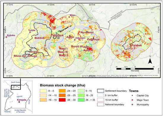 The maps presenting the biomass stock change from 2000 to 2017 in western and southwestern Uganda (Figure 7) show tree cover and biomass losses at various distances from all the refugee settlements.