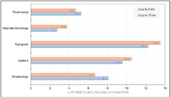 The summary of tree cover loss for the settlement in western and southwestern Uganda in Figure 8 shows that in Kyaka II, Kyangwali, and Nakivale-Oruchinga, tree cover loss was more concentrated in the 5 km buffer than in the 15 km buffer, while at Rwanwanja and Kiryandongo, the opposite was the case. In Kyaka II and Kyangwali, the overall tree cover loss from 2001 to 2018 was close to or greater than 10–13 percent in both the 5 km and 15 km buffers. The lowest tree cover loss, in terms of percentage area, was observed in the Nakivale-Oruchinga AoI, where the presence of trees was already comparatively low.