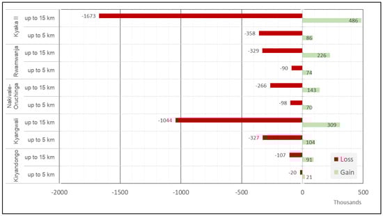 Summary of AGB stock changes across the AoIs (2000–2017) in western and southwestern Uganda. Source: World Bank and FAO, 2020b [30]. Note: Loss/gain is associated with LULC changes. For example, if there was a change from higher stock LULC to lower stock LULC, then there was a loss of biomass, and vice versa. Both of these transitions were found in all buffer zones, and respective loss/gain was estimated accordingly.