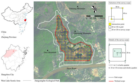 Hangzhou city, Zhejiang Province, is located on the southern edge of the Yangtze River Delta and Qiantang River Basin (30°12′ N, 120°8′ E). Hangzhou has a subtropical monsoon climate with four distinct seasons and abundant rainfall. The mean annual temperature of the city is 15.9–17 °C, and the mean annual precipitation is approximately 1100–1600 mm. Jiangyangfan Ecological Park (hereinafter referred to as Jiangyangfan Park) is located in the southeastern part of the West Lake Scenic Area. We chose Jiangyangfan Park as our research site, which is in a valley surrounded by mountains on three sides, covering a total area of 19.8 hm2 (Figure 1). With the development of ecological thought, Jiangyangfan Park became the first ecological park in China based on the “wild” concept []. The park could be roughly divided into three habitat types []: artificial and secondary forest, forest and wetland, with slightly alkaline soil []. The park used to be a silt reservoir for the dredging of West Lake. As the surface silt dries naturally, it gradually changes from lake to swamps. It has now become a secondary wetland. Since development and construction, park wetland plants have experienced more than 20 years of natural succession, forming a wide range of natural plant communities. Due to surface subsidence over time, hygrophytes such as Salix rosthornii have been affected by flooding stress for a long time []. The number of hygrophytes, such as Phragmites australis and Hydrocotyle verticillata, has increased yearly [].