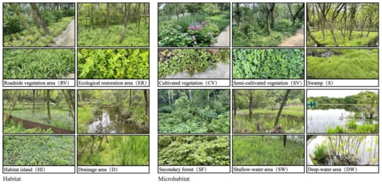In this study, we investigated spontaneous plants and environmental factors in the wetland of Jiangyangfan Park from 1st April to 13th April in 2022. A number of 40 m × 40 m grids were arranged in the wetland. After adjusting the grid, the maximum number of valid intersections was 71. The selection of some intersections was fine-tuned according to the actual situation (Figure 1). The geographic coordinates of the intersection points were recorded by a Global Positioning System (GPS). Taking the intersection as the center, we set a sample plot range of 20 m × 20 m. We set 1 m × 1 m herbs quadrats at the corners and center of the sample plot. A 10 m × 10 m trees and shrubs quadrat was set in the center. After excluding the sampling points with no plants, such as water areas, buildings, roads and other out-of-bound sampling points, 334 quadrats were retained. There were 279 herbs quadrats and 55 trees and shrubs quadrats. We took landscape elements and functions as the first-class classification index. Habitat was divided into four types: roadside vegetation area, ecological restoration area, habitat island and drainage area (Table 1). Then, according to human factors and matrix as the secondary classification indicators, the habitat was further divided into six microhabitat types (Figure 2).