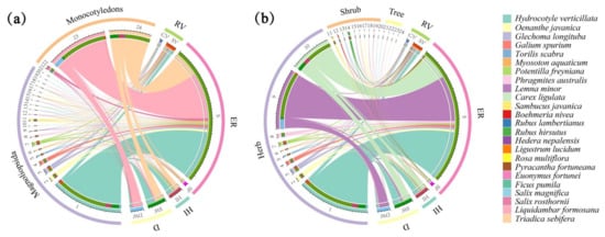 (a) Chord diagram showing the relationship between the genera of dominant spontaneous plants, the habitats at two scales and the number of species; (b) chord diagram showing the relationship between the biological characteristics of dominant spontaneous plants, the habitats at two scales and the number of species.