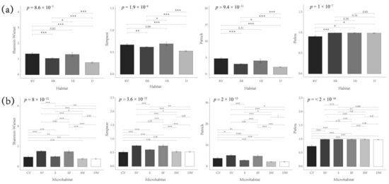 Diversity and evenness index of each habitat (a) and microhabitat (b). Note: *** p < 0.001; ** p < 0.01; * p < 0.05.