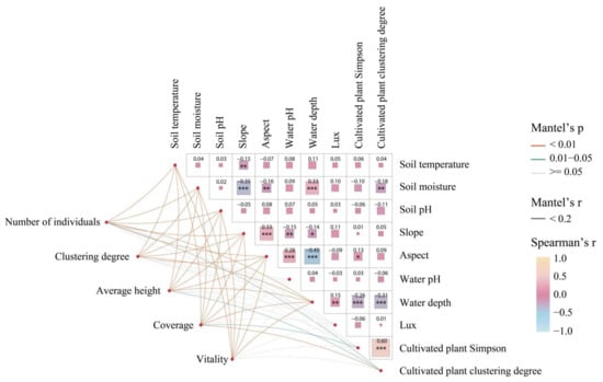 Among the environmental factors, the diversity index of cultivated plants (cultivated plant Simpson) had the strongest positive correlation with its clustering degree (Spearman’s r = 0.60). Additionally, there was a strong negative correlation between water depth and aspect (Spearman’s r = −0.45). There was no correlation between soil pH and other environmental factors. In the Spearman correlation between spontaneous plants and environmental factors, the explanation rate of Mantel’s r was not high because of the large incidental components. However, we could still obtain some information from the analysis. There was a strong correlation between the spontaneous plant cover and the clustering degree of cultivated plants (p < 0.01). Environmental factors, such as soil temperature, soil moisture and slope, have a large impact on the characteristic index values of spontaneous plants (p < 0.01) (Figure 5).