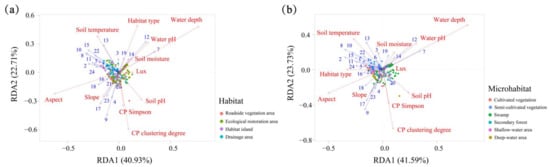 RDA ordination diagram of 24 dominant species and environmental factors at habitat (a) and microhabitat (b). 1: Ficus pumila; 2: Hedera nepalensis; 3: Salix magnifica; 4: Myosoton aquaticum; 5: Liquidambar formosana; 6: Euonymus fortunei; 7: Lemna minor; 8: Rubus lambertianus; 9: Glechoma longituba; 10: Pyracantha fortuneana; 11: Sambucus javanica; 12: Phragmites australis; 13: Salix rosthornii; 14: Hydrocotyle verticillata; 15: Ligustrum lucidum; 16: Rubus hirsutus; 17: Torilis scabra; 18: Potentilla freyniana; 19: Carex ligulata; 20: Oenanthe javanica; 21: Triadica sebifera; 22: Rosa multiflora; 23: Galium spurium; 24: Boehmeria nivea; CP Simpson: cultivated plant Simpson index; CP clustering degree: cultivated plant clustering degree.