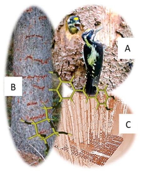 During the sap-feeding of the TTW, usually horizontal sap rings or rows of small holes penetrating the outer bark and the phloem are created on the tree trunks. Moreover, TTWs quite often tend to first peck off the periderm layer, before pecking the sap holes into the inner phloem (Figure 1B) []. Because phloem transport is locally blocked over the sap rings, phloem sugars and pressure are suspected to accumulate above the sap rings [,]. However, the effects of phloem sap-feeding of TTWs or other woodpecker species on tree defenses have not been studied. The mechanical damage of the bark structure induces anatomical and chemical defense of the phloem and cortex: e.g., wound cells are formed to repair the damage, and the cells synthesize secondary defense compounds (e.g., phenolic secondary metabolites such as (+)-catechin and stilbene glycosides, and resinous compounds such as resin acids) [].
