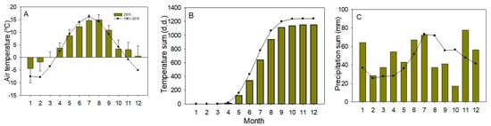 Monthly mean temperature (A), temperature sum (B), and monthly precipitation (C) during the study year (2015, bars) and the long-term average (1961–2015, dotted lines).