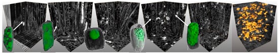 Axial, radial, and tangential cross-sections of Picea abies phloem, sampled from the xylem (left) to near the outer bark (right). In the rightmost image, the 3D renderings show the accumulation of calcium oxalate crystals (seen in white in the 2D cross-sections) in the phloem. The insets show various identified types of axial parenchyma cells, with the cell contents rendered in green and the cell walls in gray.