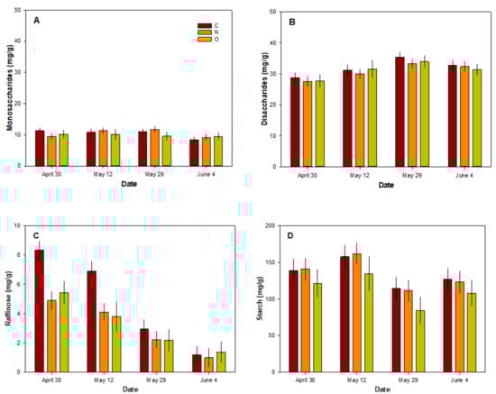 Phloem tissue had a high content of non-structural carbohydrates (NSC; 177 mg g−1 DW), from which 72% was starch and 28% free sugars, mainly sucrose (i.e., 19% of total NSC and 68% of free sugars was sucrose; Figure 9 and Figure 10). In the amount of starch, free sugars, and phenolic secondary metabolites, a statistically significant seasonal variation was observed from early spring (30 April) to early summer (4 June) in all tree-categories. By the last sampling date (4 June), the total amount of free sugars lowered significantly from that of the first three sampling dates (Figure 9). Starch and raffinose content declined significantly from late-April–mid-May to late-May–early-June (Figure 9).
