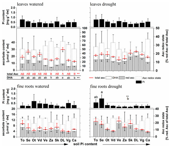 Asc content, its redox state, and Pi contents in leaves and fine roots of well-watered and drought-stressed beech saplings. Beech habitats on the x-axis are ordered according to total Pi availability in the soil (sum of Pimin and Piorg). The bars show means ± S.D.s of four replicates in the well-watered treatment and five replicates in the drought treatment. Black bars = Pi; grey bars + negative whiskers = red Asc; white bars + negative whiskers = DHA; red line + positive whiskers = total Asc (sum of red Asc and DHA); dashed bars + positive whiskers = Asc redox state. Different capital letters indicate statistically significant differences in foliar total Asc between the ecotypes. Minor letters represent statistically significant differences in foliar DHA between the ecotypes. Ns = not significant. Results were derived from one-way ANOVAs at ** p < 0.01.