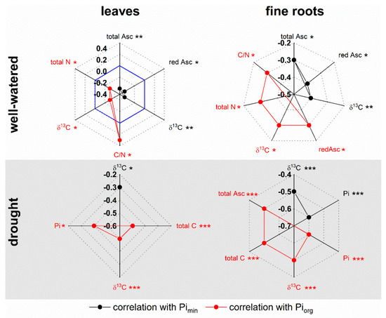 Correlation analyses were conducted to investigate whether soil-derived properties determine nutrient and/or Asc contents in leaves and fine roots. Pimin and Piorg were found to constitute the predominant factors controlling both nutrient and Asc contents in leaves and fine roots under well-watered conditions (Figure 2), while in the leaves of beech saplings of different habitats, red Asc and total Asc were negatively correlated with Pimin and foliar total N was negatively correlated with Piorg. In the leaves of the saplings, δ13C was negatively correlated with Pimin and Piorg, while the C/N ratio was positively dependent on Piorg. In the fine roots, δ13C, as well as red Asc, were negatively correlated with Pimin and Piorg. Furthermore, total Asc was negatively correlated with Pimin. While total N was negatively related to Piorg, the C/N ratio was positively correlated with Piorg.
