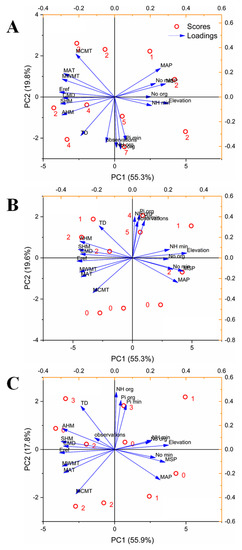 PCA analyses of fold changes of physiological parameters and growth conditions in the natural habitats of the beech saplings analyzed. Red dots and red numbers indicate the total number of significant fold changes upon drought (A), in leaves (B), and in the fine roots (C). Parameters describing growth conditions in the habitats of origin are given in black. The data are taken from Table 6.