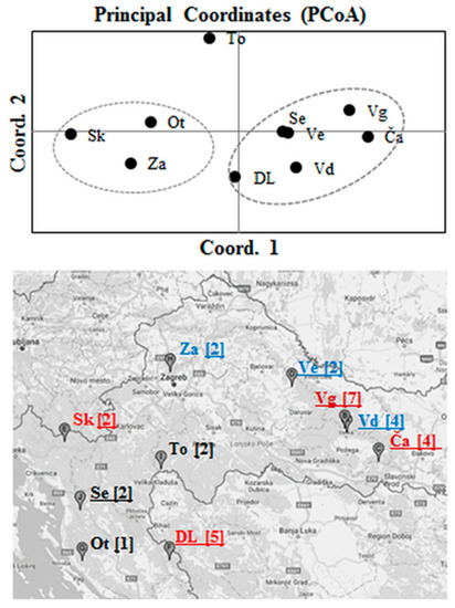 The genetic distances among populations were relatively small, with the population Sk most differentiated from populations Vg and Ča, as shown by the PCA (Figure 4). The PCA indicated two groups of populations, while To differed distinctly from all other populations. Apparently, the Croatian populations did not show high genetic differentiation between each other. Nevertheless, a spatial genetic structuring was observed, with the eastern populations (Vd, Vg, Ča and Ve) being more similar to each other than the populations in the western part of the country.