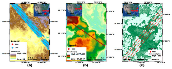 GEDI footprints at three sites. (a) Site a was located in Quintana Roo, Mexico; the base map of this site comprises the elevation information from SRTM data. (b) Site b was located in New Jersey, US; the base map of this site comprises the elevation information provided by airborne lidar observations. (c) Site c was located in New Hampshire, US; the base map of this site is a biomass map derived from airborne lidar observations.