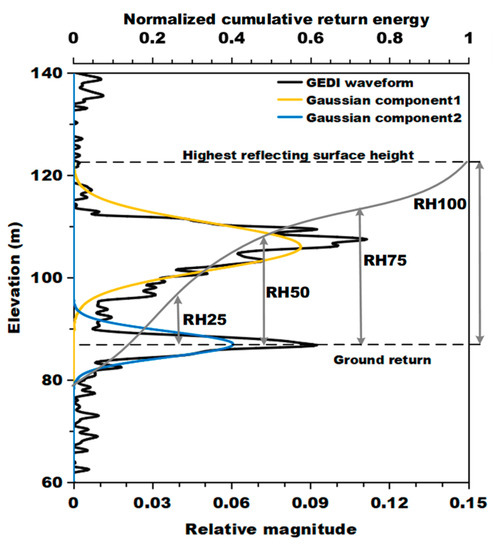 Based on the waveform noise thresholds, the effective waveform was located. We then used the effective waveform to calculate the 25th, 50th, 75th, and 100th percentile heights (RH25, RH50, RH75, and RH100), as shown in Figure 2. First, the total waveform energy was calculated by summing the waveform energy from the beginning to the end of the signal. Afterward, the RH25, RH50, RH75, and RH100 were calculated by comparing the corresponding accumulated percentile energy with total energy. All these percentile heights refer to the ground position.