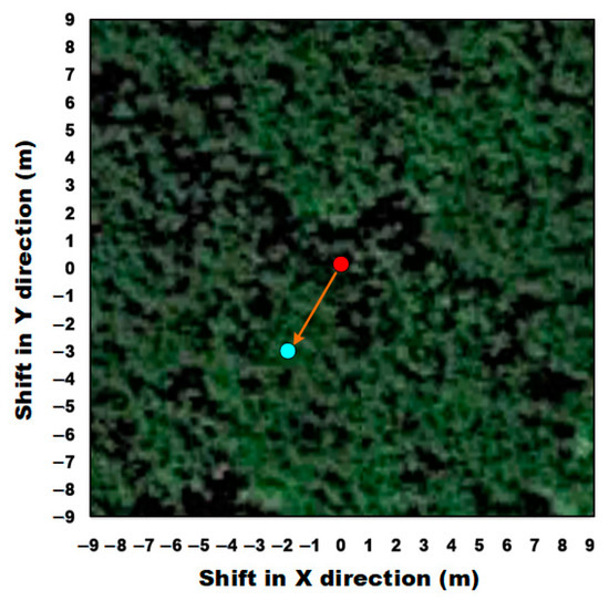 The GEDI science team states that the geolocation data provided by the GEDI product are subject to random errors, with an error of about ±9 m [35]. This uncertainty factor will affect the effectiveness of the GEDI observation in biomass estimation to a certain extent. In this study, we adopted a strategy to quantitatively evaluate GEDI geolocation errors to address this uncertainty by referring to previous research [34]. Our strategy assumed that the geolocation information from the airborne lidar was correct since the georeferencing errors of the airborne lidar can be negligible compared to those of GEDI. The strategy mainly included two steps (Figure 4): step one was to shift the center of the footprint along the x-axis and y-axis in a (−9, 9)-m window with an interval of 1 m; step two was to take the correlation between the GEDI waveform and the simulated waveform as an evaluation criterion to locate the potentially correct geolocation of the GEDI footprint centroid.