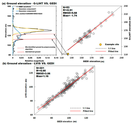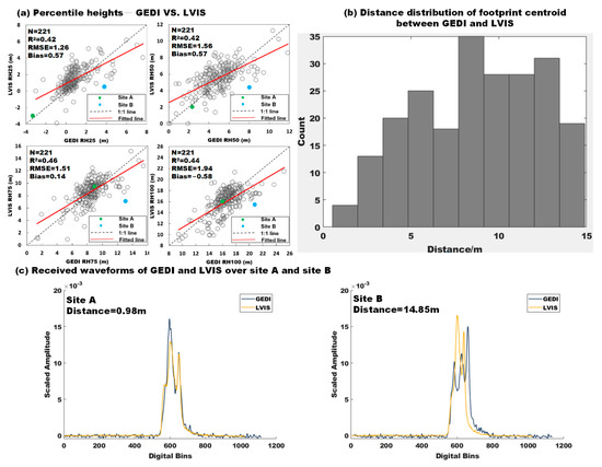 We selected two typical sites to further explain the effect of the inconsistency of observations on our comparison results (Figure 9c). As the LVIS and GEDI observations showed an almost coincident footprint centroid at site a, the received lidar waveforms were the same for both (Figure 9c). Therefore, percentile height metrics derived from site a showed good agreement (Figure 9a). For site b, however, the footprint centroids between LVIS and GEDI were not coincident, with a 14.85 m distance between them (Figure 9c); the received lidar waveform and percentile height metrics from site b showed a relatively significant bias (Figure 9a). The above evidence can explain the impact of geolocation differences between GEDI and LVIS on our validation analysis to some extent.