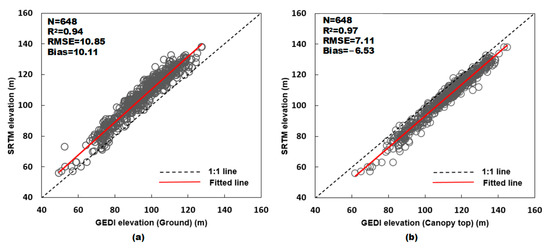 Comparison scatters plots of elevation provided by GEDI and SRTM: (a) ground elevation between SRTM and GEDI, and (b) ground elevation and GEDI canopy top elevation.