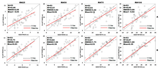 Comparisons of four typical percentile heights (RH25, RH50, RH75, and RH100) provided by GEDI and G-LiHT lidar observations: graphs in row (A) use data without the geolocation error revised; graphs in row (B) use data that have undergone geolocation revision.