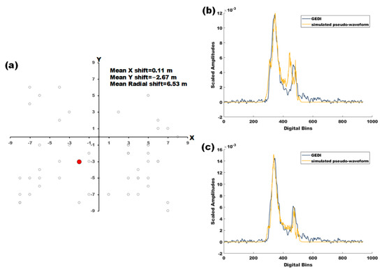 Diagram of shift-searching process to estimate the geolocation error of the GEDI: (a) is the potential geolocation error of the used GEDI data in site b; (b) is the comparison of the GEDI received waveform and simulated waveform derived from G-LiHT data; here, we used the footprint centroid of GEDI without the geolocation error revised; and (c) is also the comparison of the waveform between GEDI and G-LiHT; it should be noted that here the used footprint centroid of GEDI has the geolocation error revised, the red point shown in (a) is the offset of the footprint centroid.