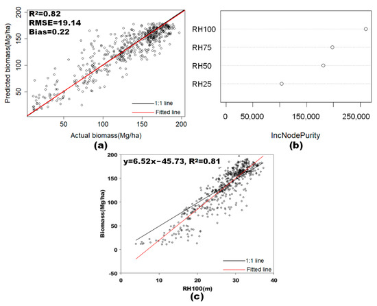 The advantage of Random Forests is that it can evaluate the importance of input variables to the output result. Figure 10b shows the importance of each percentile height calculated from the node purity of the Random Forests in predicting biomass. Four typical percentile heights all played a crucial role in biomass estimates, of which RH100 was the variable most sensitive to the variation in biomass. Table 2 shows the ability of each percentile height to estimate AGB, which was calculated based on the linear regression method. The t-test was used to test if the regression equations for the biomass estimates were statistically significant—the p-value of 0.00 was less than the default significance level of 0.05, indicating a significant linear regression relationship between the response biomass and the predictor variables. Results showed that the RH100 was able to explain 81% of the variance associated with the reference biomass; the RH25 predicted the relatively worst biomass, which was able to explain 35% of the variance in biomass.