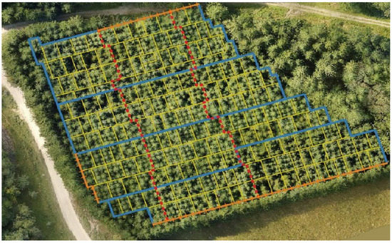 The survival rate (Sr), tree height (Th), diameter at breast height (Dbh), tree slenderness (Ts), and crown diameter (Cd) were measured for 24 families of the pendula variety and for 24 families of the pyramidalis variety; both varieties were 25 years of age. In addition, we used a cross validation mortality check using capture images (Figure 2) with an unmanned aerial vehicle (UAV) processed in Qgis software (version 3.24) [55].