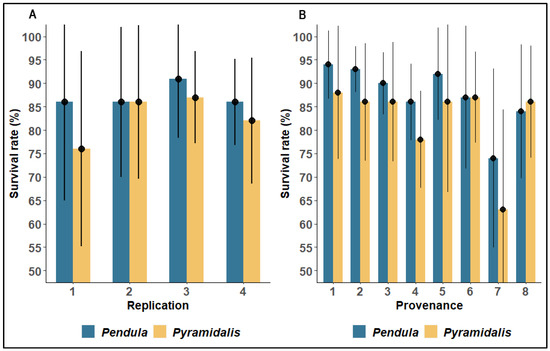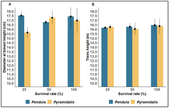 Variation in the growth traits: diameter at breast height (A) and tree height (B) by survival rate. The black vertical lines represent the standard deviation.