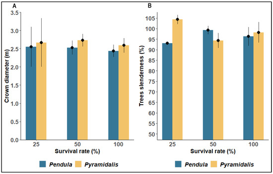 Variation in stability traits: crown diameter (A) and tree slenderness (B) by survival rate. The black vertical lines represent the standard deviation.