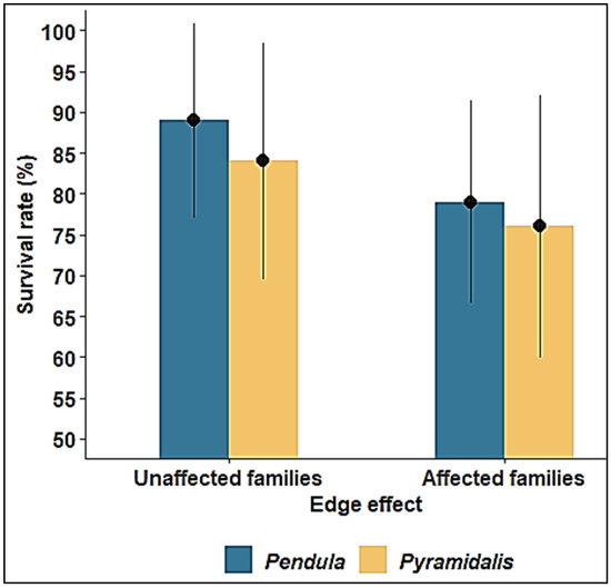 On average, the pendula variety showed a 3% higher adaptability to the edge effect (Figure 6) than normal spruce as well as higher Sr for the unaffected families (p > 0.05). Differences between the affected and unaffected families were distinctly significant (p < 0.01), and it was found that the Sr of the unaffected families was higher.