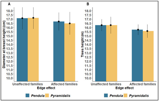 Variation in the growth traits: diameter at breast height (A) and tree height (B) by the edge effect. The black vertical lines represent the standard deviation.